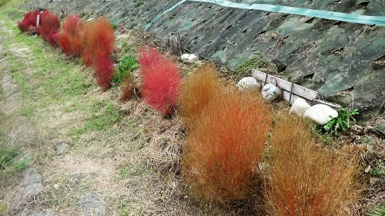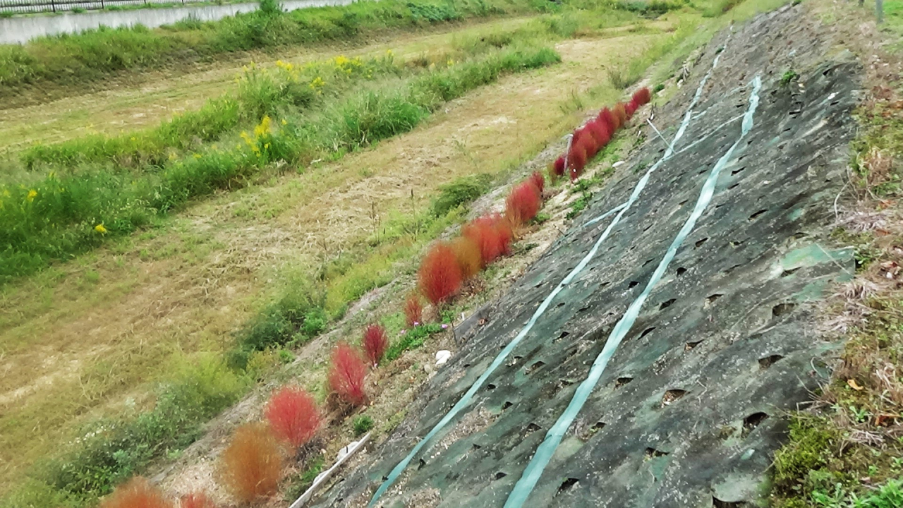 見て楽しい 秋に咲くコキアの植栽体験されたご報告 いつも当会の運営にご協力頂き有難うございます。 社会福祉協議会様の8月度広報で募集しました善光寺川周辺での紅葉が楽しめる種子から育てるコキア花苗の植栽体験に5名の参加者で善光寺川沿いにて苗を植栽して頂きました10月20日現在の状況です。11月にかけて更に赤色に色づいてきますので色の変化をお楽しみください。